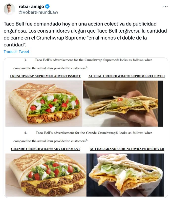 “Taco Bell no revela adecuadamente el peso de la carne o el relleno”, dijo Russo en un correo electrónico. “El demandante no realizó ninguna compra del producto basándose en ninguna información sobre el peso, sino únicamente en la imagen del producto, como creemos que hace la mayoría de los consumidores”.