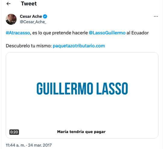 En 2017, personal de Neurona manejaba un grupo de cuentas que aparentaban ser personas reales en Twitter (es decir, trolls). Estas diseminaron contenidos falsos creados por la consultora y usaron etiquetas prejuiciosas como #Atracasso y #Paquetasso, anunciando que el entonces candidato presidencial ecuatoriano de oposición, Guillermo Lasso, implementaría un “paquetazo tributario” al ganar la Presidencia y que la medida aumentaría hasta un 129% el impuesto de la renta. El analista tributario Andrés Flores Jurado dijo a esta alianza que si bien la cifra de aumento de renta sí podría darse en caso de que la reforma se aprobara, ésta no fue propuesta por Lasso, sino fue una recomendación de la Cámara de Comercio ecuatoriana a todos los candidatos. La abogada tributaria Yael Ferro coincidió con Flores en que esa propuesta no podía ser endosada al entonces candidato. No obstante, el propio Hernández compartió la atribución a Lasso.