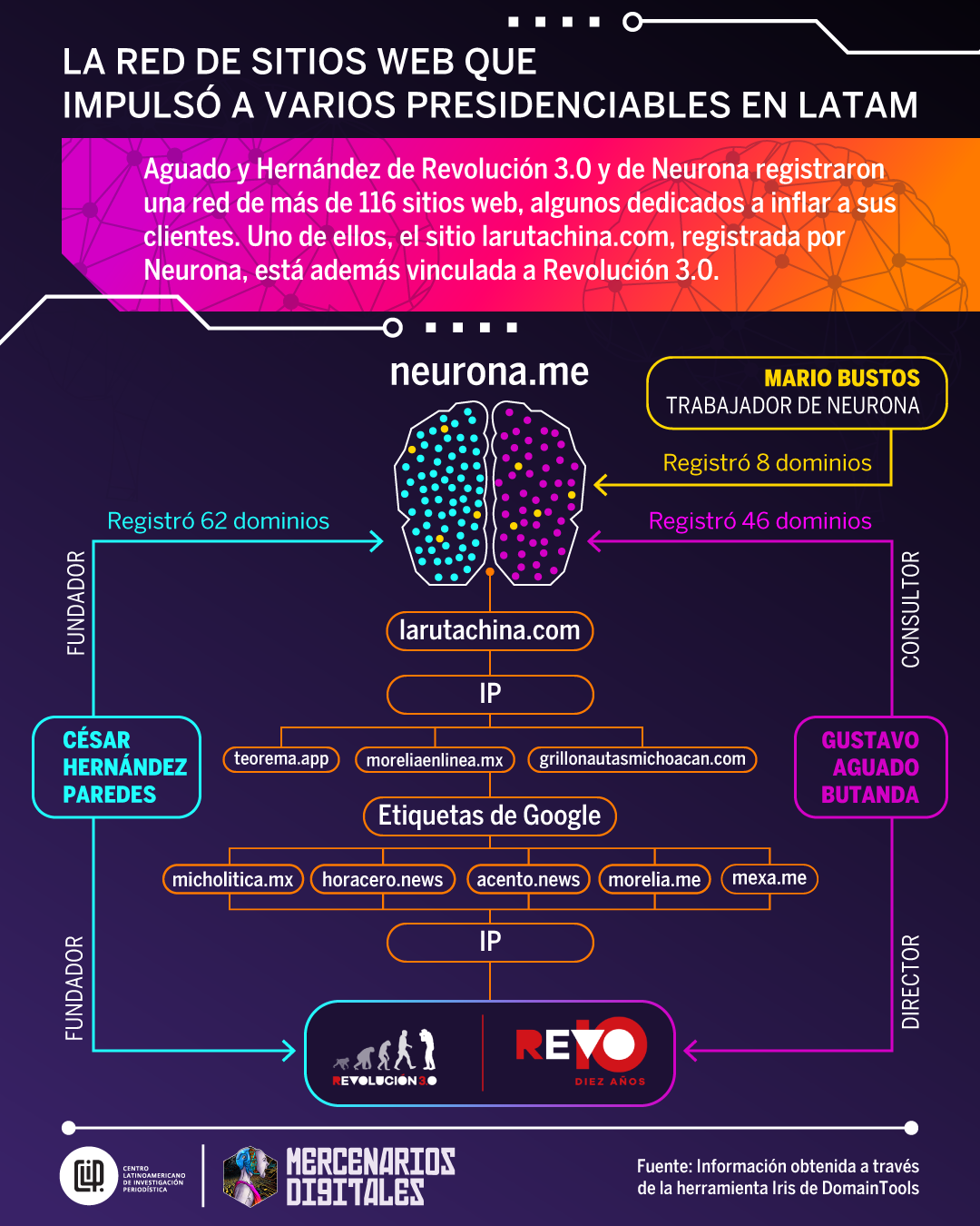 Esta investigación identificó además una red de páginas web con una forma de operar casi idéntica a la que utilizó Neurona en el pasado, pero a cargo de Revolución 3.0. Se trata de diez portales, ocho de los cuales se presentan como noticieros, que publican contenidos de forma coordinada y pagan anuncios en Facebook para posicionar una buena imagen de Michoacán, México, y de su gobernador Alfredo Ramírez Bedolla (de Morena), así como críticas a su exgobernador, Silvano Aureoles, del Partido de la Revolución Democrática (PRD).Esta decena de portales interconectados no son ajenos a la telaraña de webs, descubierta por esta alianza periodística, que por años manejó Neurona para posicionar a las izquierdas latinoamericanas. Un dominio que lleva por nombre larutachina.com es el nexo que vincula a ambas mallas, la del pasado y la nueva.