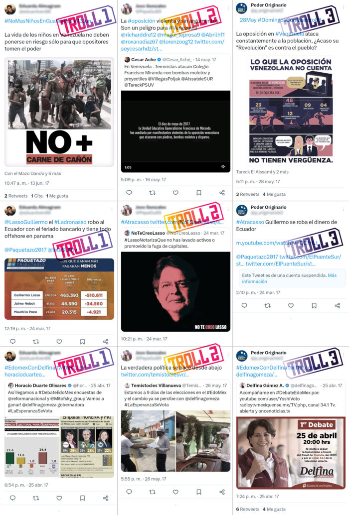Ese año, la decisión del Tribunal Supremo de quitar competencias al Congreso venezolano provocó la mayor oleada de manifestaciones antigubernamentales de la década, que dejó al menos 105 asesinatos en los que estuvieron involucrados agentes del Estado o colaboradores paramilitares. Los hallazgos de esta alianza muestran que, junto con los mensajes contra Lasso, estas cuentas publicaron hasta 1.265 tweets, en los que también culparon a la oposición venezolana por las muertes de los manifestantes.