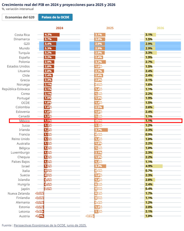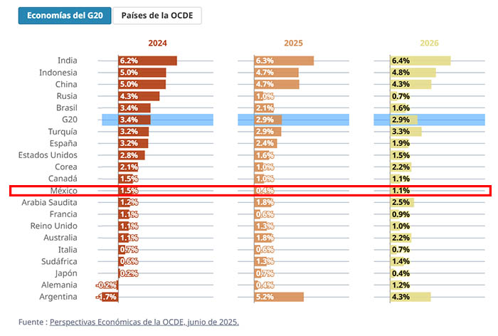 México registrará en 2025 el menor crecimiento económico de América Latina, con una expansión prevista de apenas 0.4 %, según las últimas perspectivas de la Organización para la Cooperación y el Desarrollo Económicos (OCDE).