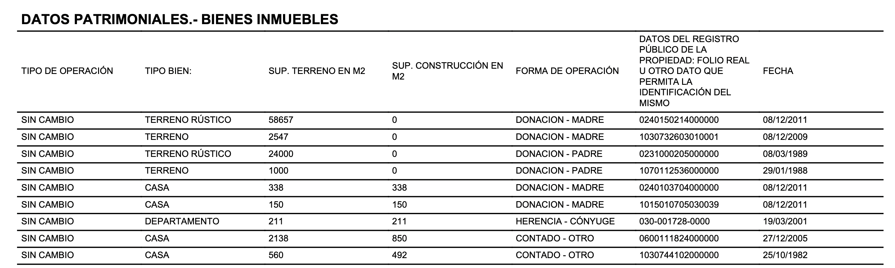 En ese municipio, su declaración reporta un terreno de 58 mil 657 metros cuadrados que le fue donado por su madre en diciembre de 2011, cuando no tenía ningún cargo público, pues ya había dejado la gobernatura del Estado de México y apenas era aspirante a precandidato para la presidencia de la República. El terreno es de tipo rústico, “cultivable”, y se ubica en el ejido Bombatevi.