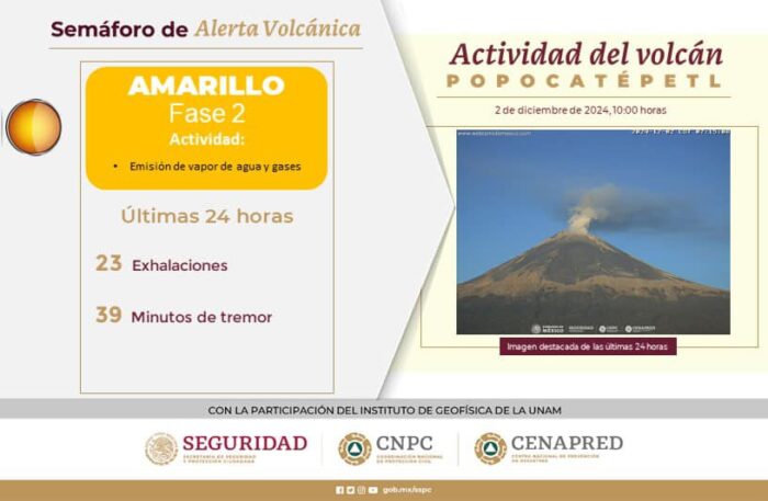 El Semáforo de Alerta Volcánica del Popocatépetl se encuentra en Amarillo Fase 2.