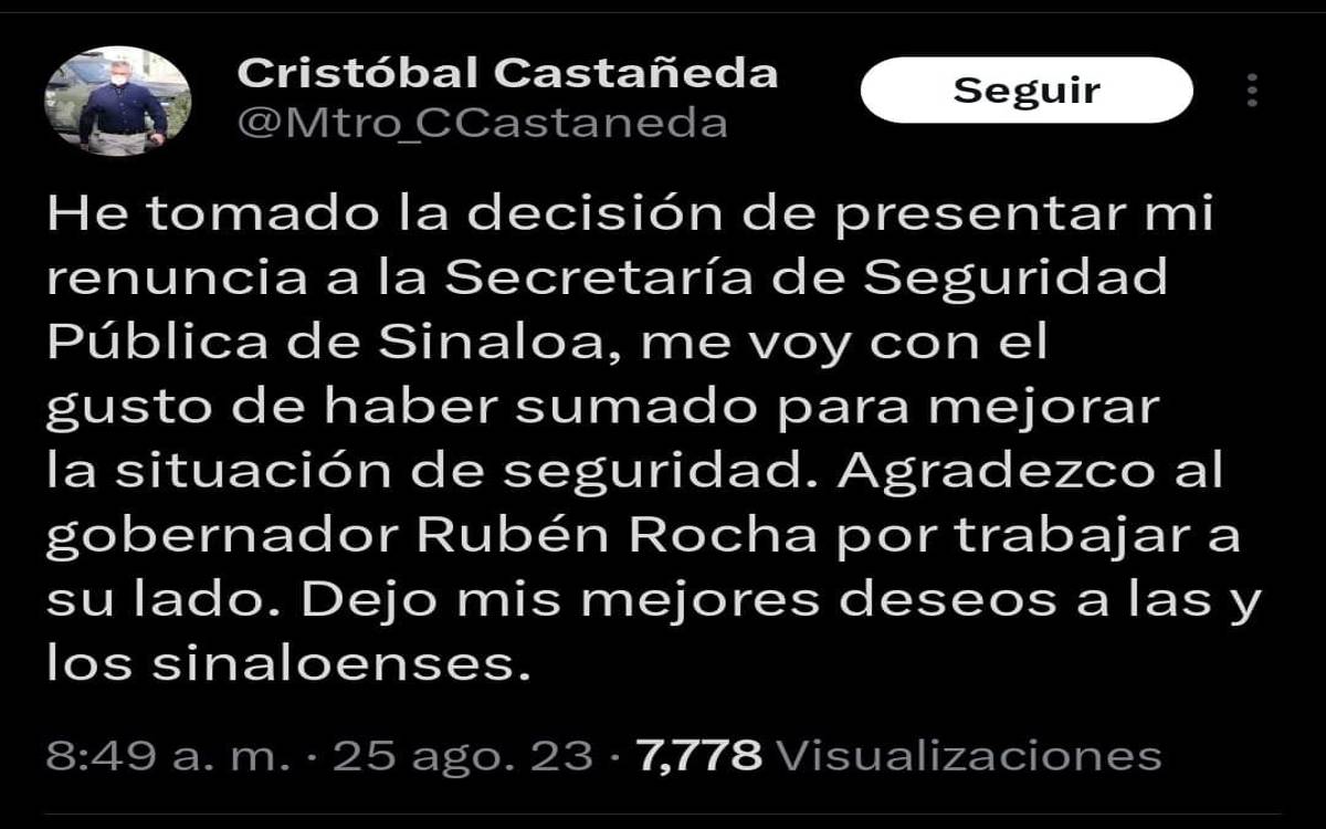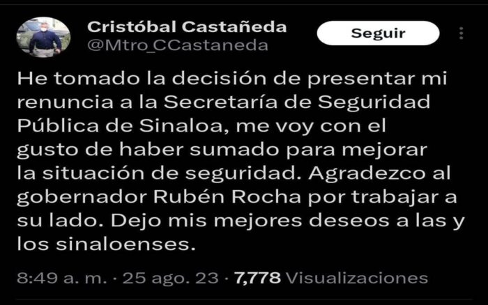 “He tomado la decisión de presentar mi renuncia a la Secretaría de Seguridad Pública de Sinaloa, me voy con el gusto de haber sumado para mejorar la situación de seguridad. Agradezco al gobernador Rubén Rocha por trabajar a su lado. Dejo mis mejores deseos a las y los sinaloenses”, dijo entonces.