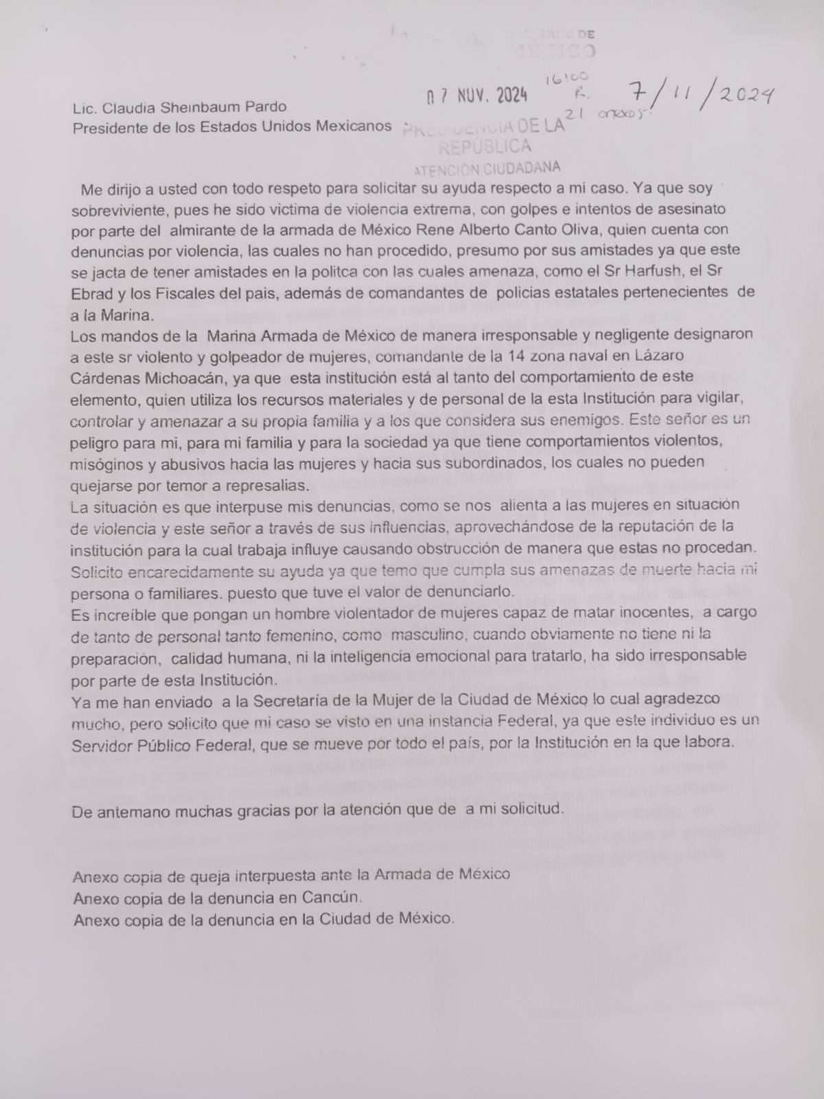 Narró una serie de episodios que, aseguró, ocurrieron a lo largo de su matrimonio. Señaló que ha presentado quejas ante distintas instancias, entre ellas el órgano interno de control y la inspección de la Secretaría de Marina, así como cartas al entonces presidente Andrés Manuel López Obrador y a la presidenta Claudia Sheinbaum.
