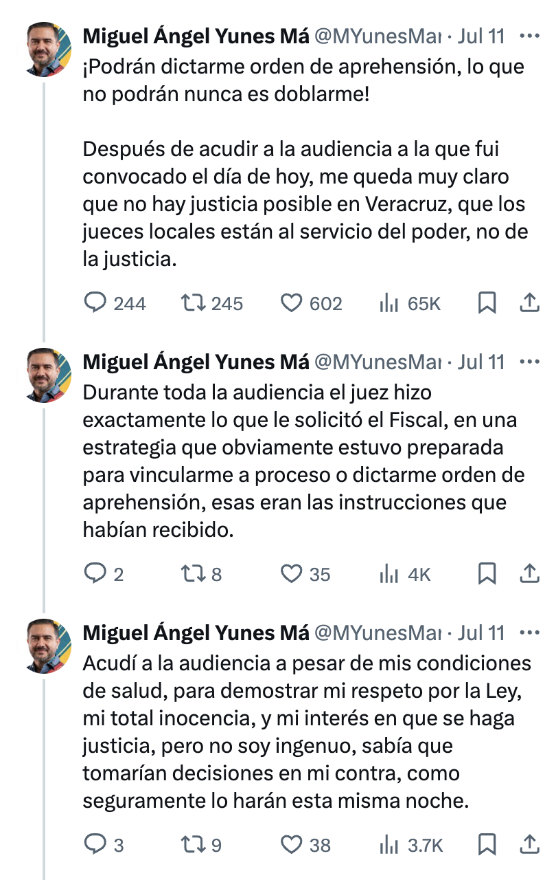 Yunes Márquez afirmó que acudió a la audiencia “a pesar de mis condiciones de salud par demostrar mi respeto por la ley“: “es una vergüenza que los órganos de justicia de Veracruz se utilicen no para perseguir delincuentes sino para perseguir opositores, adversarios”.