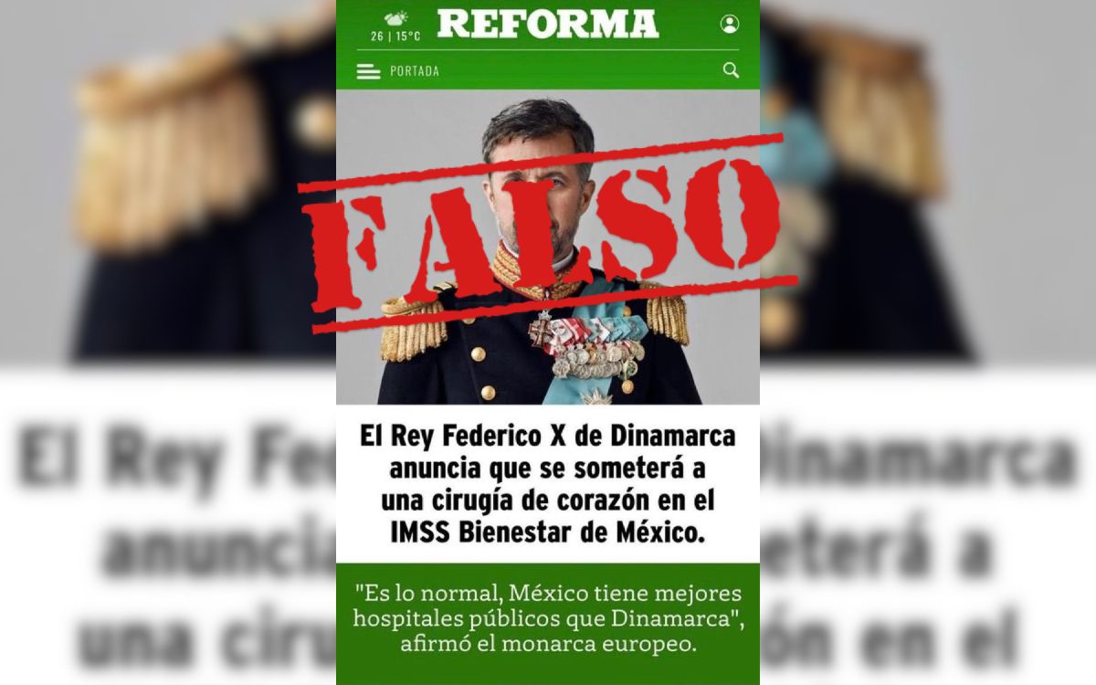 EFE Verifica recibió una consulta a través de su canal de WhatsApp sobre una supuesta noticia publicada en la web del diario mexicano Reforma, en la que se asegura que el monarca danés se sometería a una cirugía del corazón en el Instituto Mexicano del Seguro Social (IMSS).