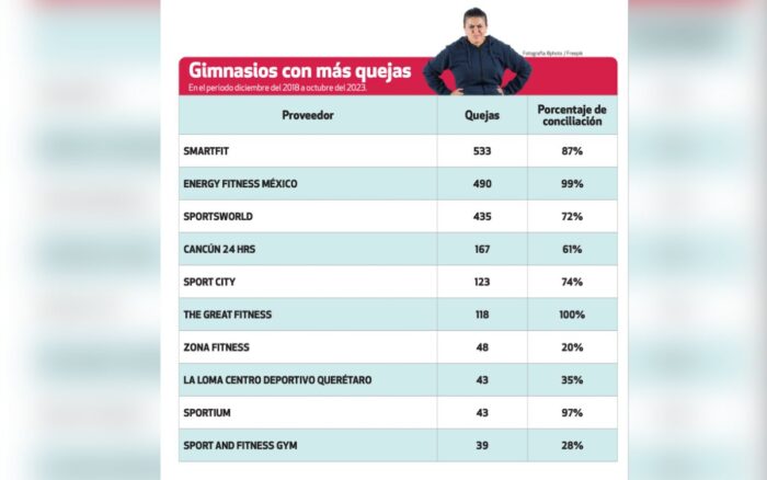 En primer lugar se encuentra Smart Fit, con 533 quejas y un porcentaje de conciliación del 87%. Le sucede Energy Fitness México con 490 y un índice de conciliación ubicado en 99%.