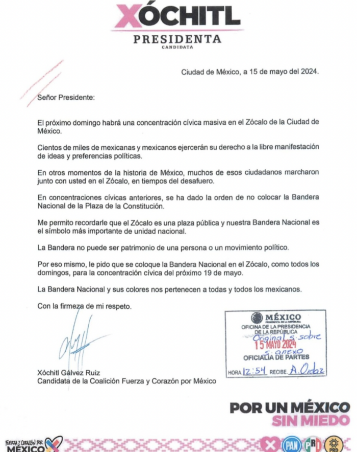 En una misiva dirigida al mandatario mexicano, la candidata de oposición a la Presidencia, Xóchitl Gálvez Ruiz, le pidió que el 19 de mayo se mantenga la bandera izada durante la Marcha por la Democracia que la ‘Marea Rosa’ ha convocado para este domingo.
