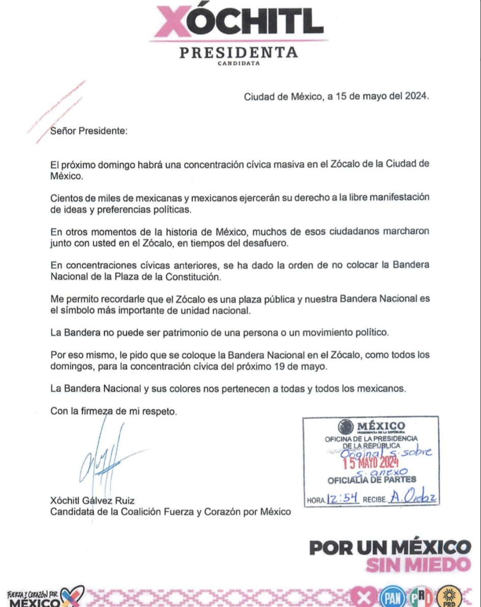 En una misiva dirigida al mandatario mexicano, la candidata de oposición a la Presidencia, Xóchitl Gálvez Ruiz, le pidió que el 19 de mayo se mantenga la bandera izada durante la Marcha por la Democracia que la ‘Marea Rosa’ ha convocado para este domingo.