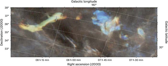 Posteriormente, contrastaron dicha información con aquella obtenida de la “Cinta local de nubes frías” (LRCC, por sus siglas en inglés). Dicha “cinta” es un conjunto de nubes interestelares muy frías situadas en la constelación del Lince.