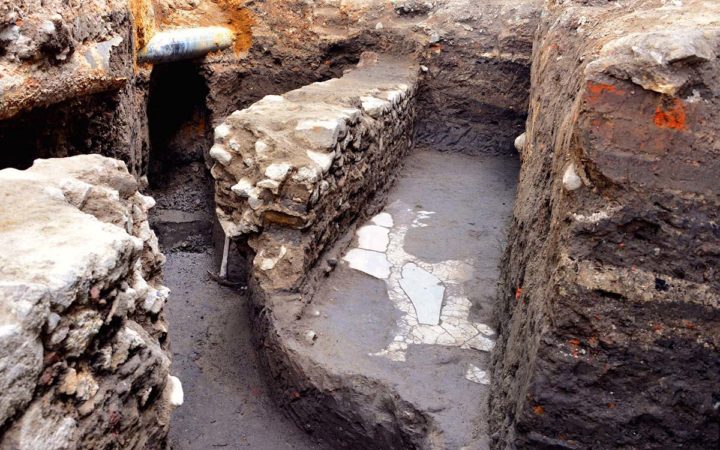 Juan Carlos Equihua dijo que resultó desconcertante hallar este piso del Posclásico Tardío (1350-1519 d.C.) a solo 1.20 metros de profundidad, cuando en la parte sur de la excavación, donde estuvieron expuestos 20 metros del muro original, las evidencias de la transición entre los periodos prehispánico y colonial se encontraban a 2.50 metros bajo la superficie.