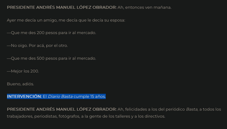 En la versión estenográfica realizada por el gobierno no se anotó ninguna pregunta o tema al aire que lanzaron los reporteros. Con una excepción: sí aparece la mención al diario Basta que sí escuchó el Presidente de la República.