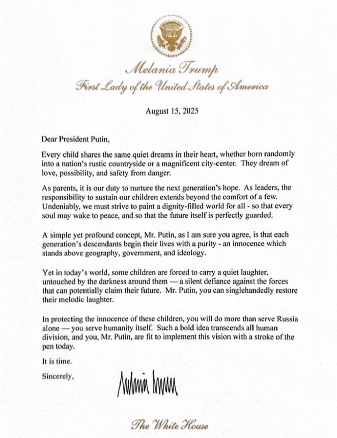 Melania Trump, primera dama de Estados Unidos, envió una carta al presidente de Rusia, Vladimir Putin, que le fue entregada por el mandatario Donald Trump, durante su encuentro del viernes en Alaska, informó este sábado Fox News.