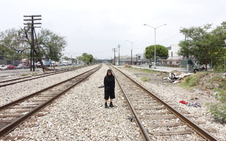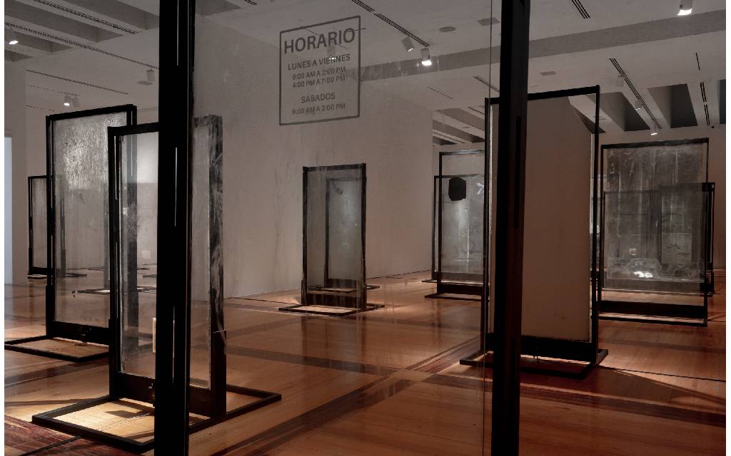 Más adelante, encontramos Sin título, una de las comisiones encargadas por el MARCO para la exposición. La instalación presenta 32 paneles de vidrios recuperados de espacios abandonados a causa de la erosión del tejido social, mientras se recorre la sala se escuchan audios de los trenes que se desplazan del sur al norte de México y que llevan migrantes. Cada vidrio alude a uno estados del país. “La Bestia no tiene horarios y mientras pasa observas. En Ciudad Juárez grabamos el sonido de este corazón que atraviesa el país. El temor de que se rompa el vidrio es el temor que cada familia siente por perder a su hijo”, apunta la artista.