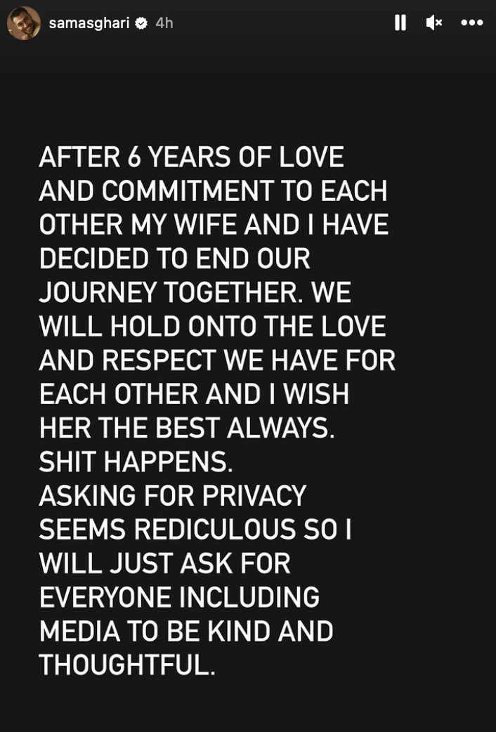 “Después de 6 años de amor y compromiso mutuo mi esposa y yo hemos decidido poner fin a nuestro viaje juntos. Nos aferraremos al amor y respeto que nos tenemos y le deseo lo mejor siempre”.