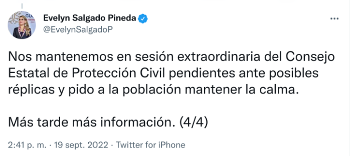 “Instruí a Protección Civil de Guerrero realizar recorridos de supervisión en inmuebles y edificios escolares en coordinación con las unidades en los 81 municipios de la entidad, además me mantengo en constante comunicación con las presidencias municipales”, informó la mandataria guerrerense a través de sus redes sociales.