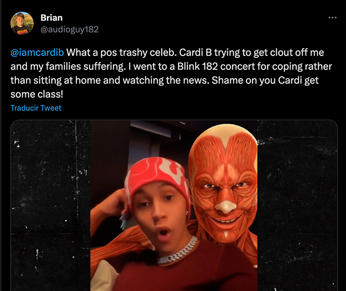 “Cardi B tratando de quitarme influencia y el sufrimiento de mi familia. Fui a un concierto de Blink 182 para sobrellevar la situación en lugar de sentarme en casa y ver las noticias”, escribió.