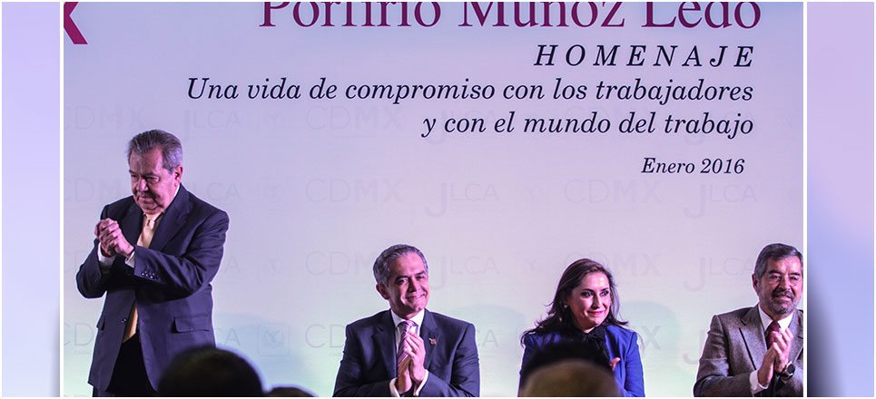 El coordinador de la Unidad para la Reforma Política del Distrito Federal, Porfirio Muñoz Ledo, recibió un homenaje de la Junta Local de Conciliación y Arbitraje del Distrito Federal (JLCA), en el marco de su niversario 90, por sus aportaciones trascendentes al mundo del trabajo.