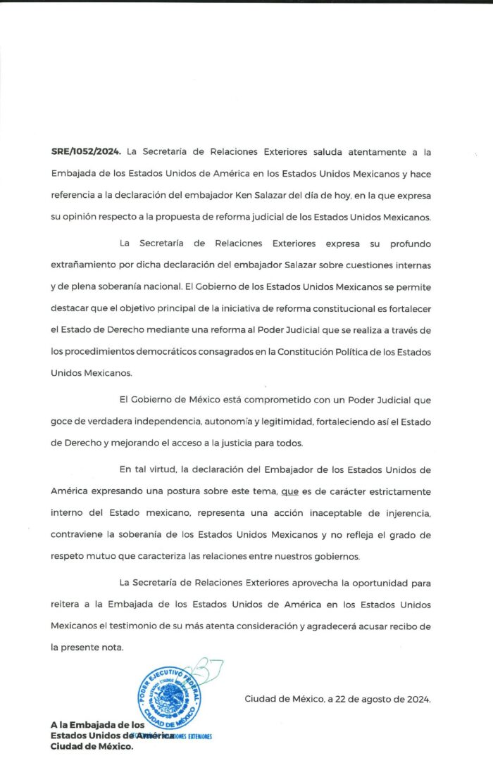 Aquí la carta completa enviada por la SRE a la Embajada:
