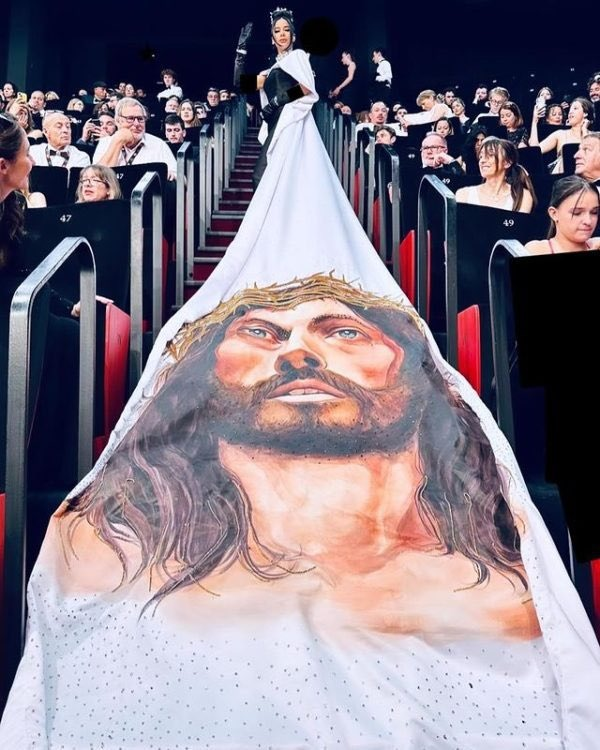 Video | Intentan impedir mostrar vestido con el rostro de Jesucristo a actriz en Cannes
