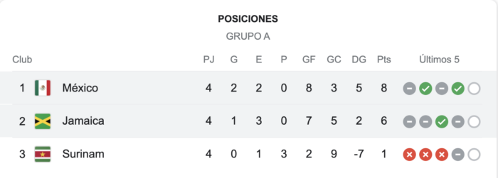Con este resultado, México llegó a 8 puntos en el primer lugar del Grupo A, escoltado por Jamaica con 6 unidades y más atrás Surinam con 1. Jugará la Semifinal en Las Vegas, Nevada, el 15 de junio.