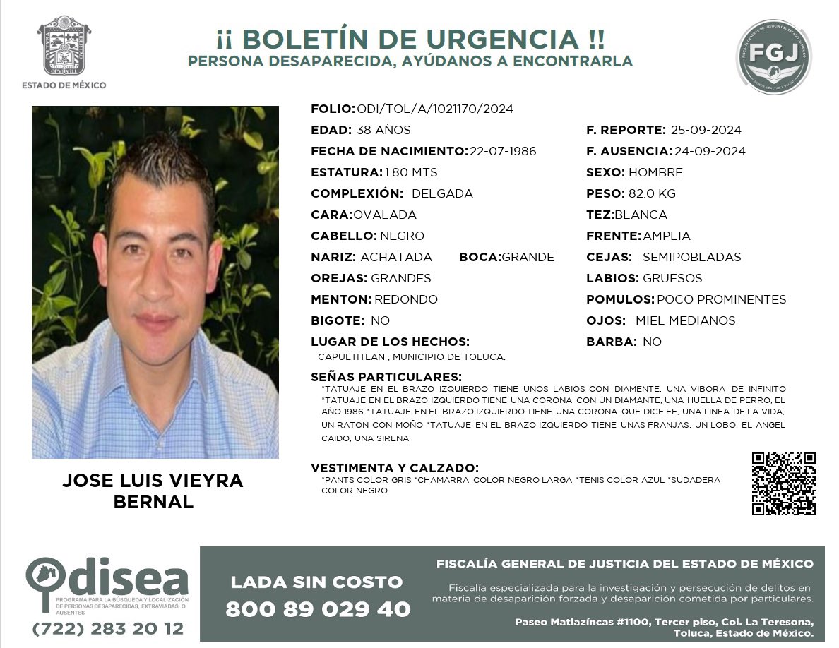José Luis Vieyra Bernal fue visto por última vez el 24 de septiembre en la capital mexiquense.