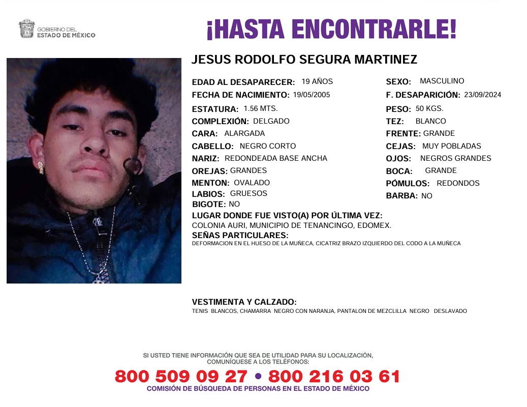 La Comisión de Búsqueda de Personas del Estado de México mantiene activa la alerta de búsqueda de Jesús Rodolfo Segura, joven de 19 años.