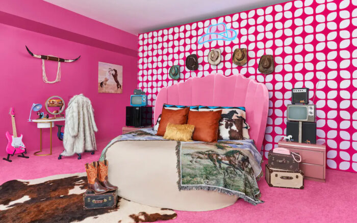 Si tú resultas uno de los afortunados para pasar un día en la casa de Barbie, prepárate para vivir un ambiente muy kitsch en donde las botas, los sombreros y caballos contrastan con la temática rosa del mundo de Barbie.