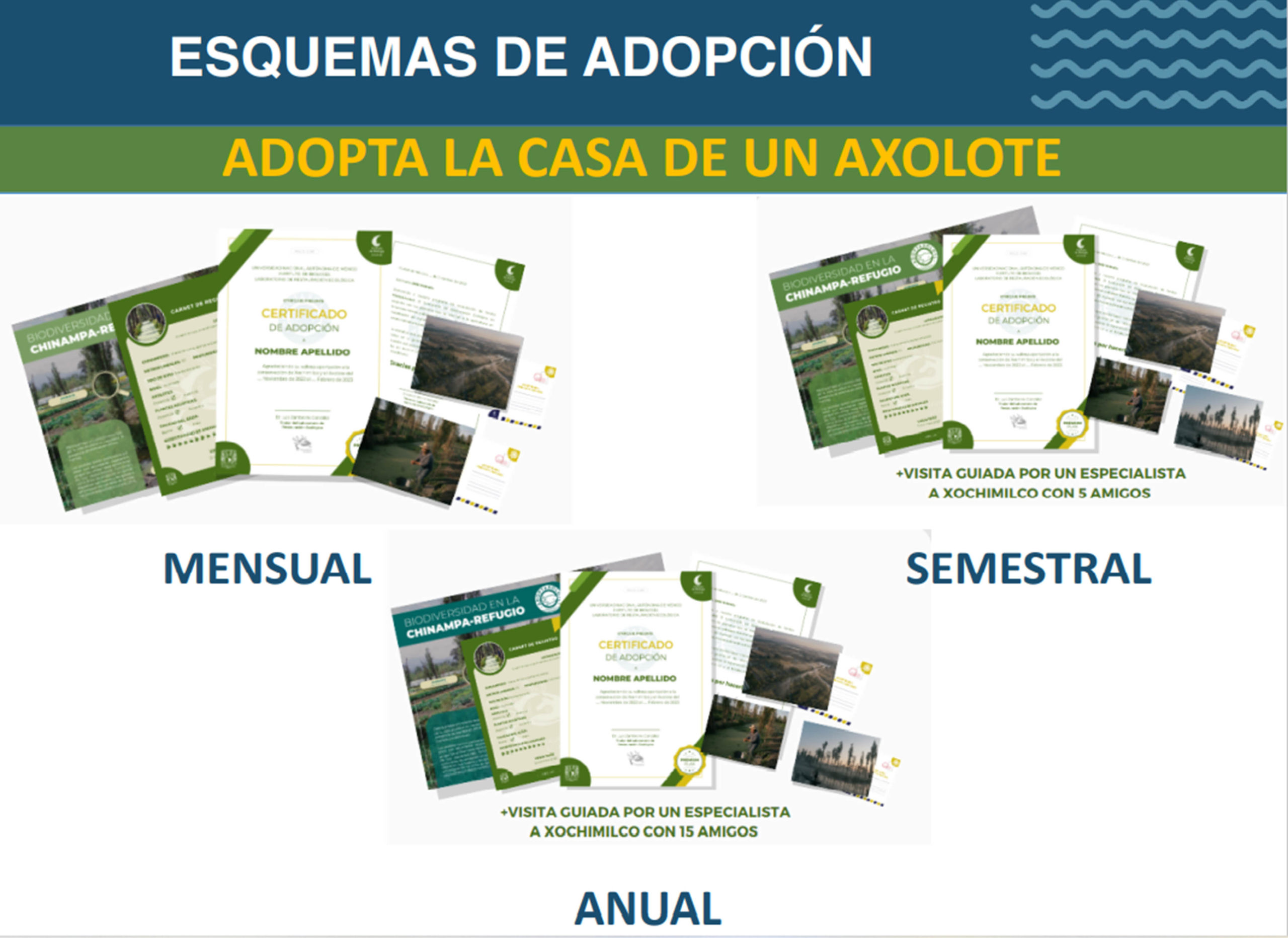 Este año los académicos y la Universidad Nacional Autónoma de México (UNAM), lanzan la campaña internacional de recaudación de fondos llamada “AdoptAxolotl”, para así continuar con esta importante conservación animal y el rescate de su hábitat en chinampas-refugio que mantienen una barrera contra los depredadores de ajolotes, así como las labores con los chinamperos del lugar que participan en actividades agrícolas tradicionales y en el cuidado de estos refugios.