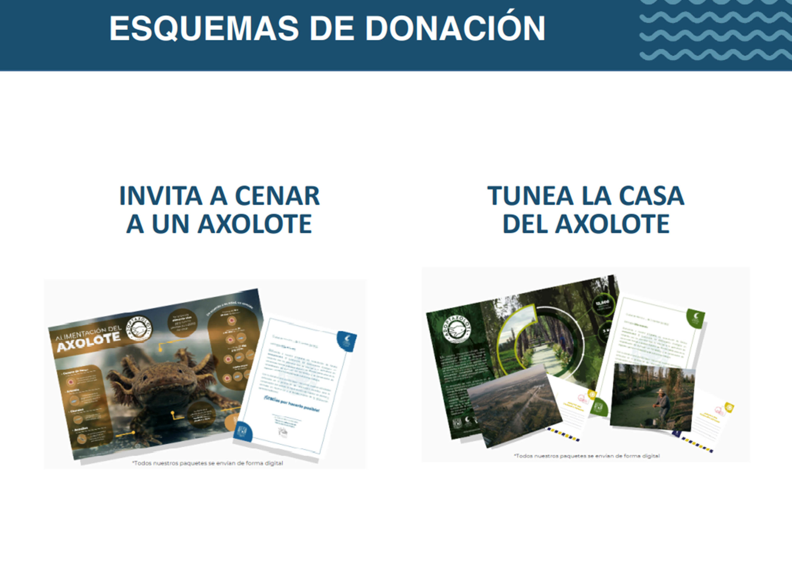 Por su parte, la coordinadora de la campaña, Diana Laura Vázquez Mendoza, explicó en el evento de lanzamiento que tienen dos esquemas de donación directa: Invita a cenar a un ajolote, para los insumos del mantenimiento de la colonia; y otro que se llama Tunea la casa del ajolote, dirigido al mantenimiento de chinampas-refugio en Xochimilco.
