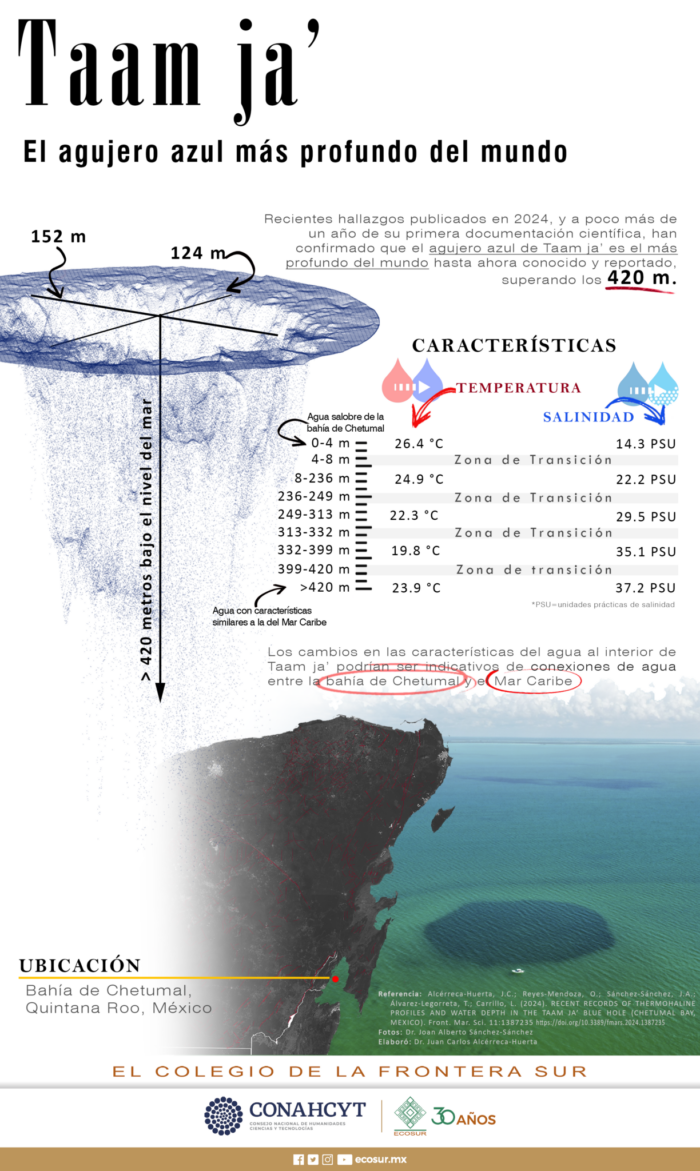 Fue entonces que un equipo de personas científicas de Investigadores por México del Consejo Nacional de Humanidades, Ciencias y Tecnologías (Conahcyt), y personal académico de su Centro Público El Colegio de la Frontera Sur (Ecosur) indicaron que el Taam Ja’ (agua profunda) tenía una profundidad que en su momento registró 274.4 metros.