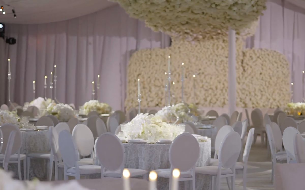 Tanto la ceremonia como la fiesta estuvieron decoradas con flores blancas que cubrieron mesas, techo y pasillos.